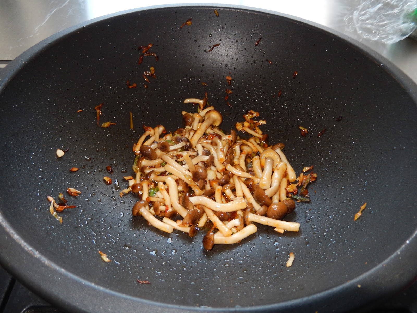 Pijpajuin, look en champignons kort wokken op hoog vuur in geutje wokolie...